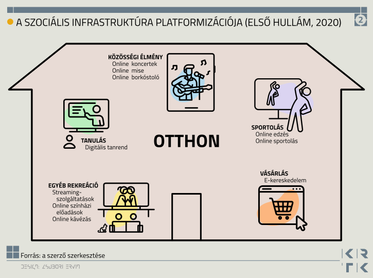 A szociális infrastruktúra platformizációja révén világszerte egyetlen fizikai lokáció, az otthon vált a kapcsolódások terepévé. 2020 lezárásai alatt a legkülönfélébb tevékenységek költöztek az online térbe, melyek korábban mind különböző fizikai helyeken (és szociális infrastruktúrában) valósultak meg. Példaként az online mise (templom), borkóstoló (étterem, borászat), színházi előadás (színház), koncert (szórakozóhely, koncertterem), jógaóra (stúdió), tárlatvezetés (múzeum), tanulás (iskola) és így tovább.