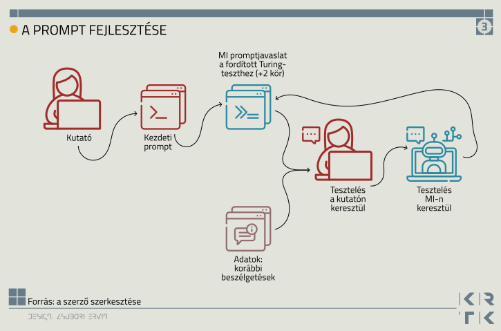 Kutatásunk egy háromfázisú, egyedülálló mini kísérletre épült, amelyben Turing-tesztet végeztünk összesen 12 ember résztvevő bevonásával. A három fázis egymásra épült: elsőként ember–ember, majd ember–AI, végül AI–AI beszélgetéseket vizsgáltunk. A többfázisú szerkezet újdonságot jelentett, és lehetővé tette, hogy külön rálássunk az egyes viszonyokra és teljesítményekre, valamint azok változására.