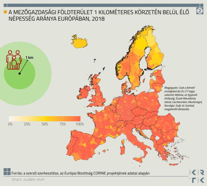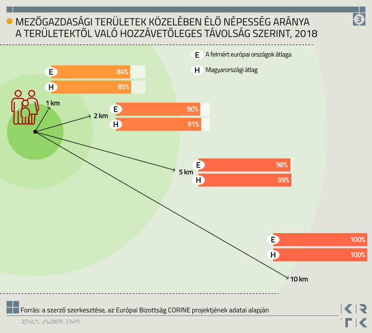 Magyarországon 2018-ban különösen magas a közelség: a népesség kb. 85%-a 1 km-en belül él mezőgazdasági területhez képest, és ezen belül kiemelkedően erős a szántóközeli arány (1 km-en belül kb. 74%).