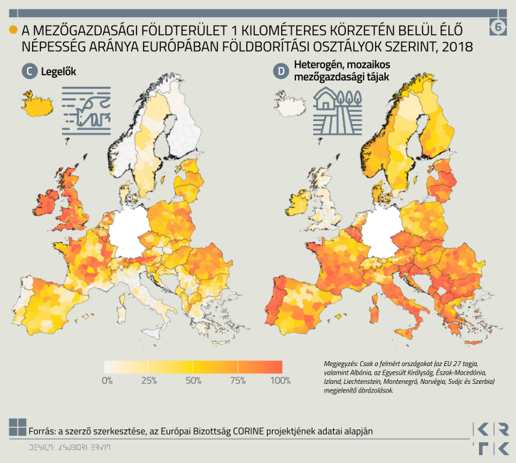 Európában a mezőgazdaság nemcsak termelési ágazat, hanem térbeli közelség: lakókörnyezet, tájkép, konfliktus- és együttélési zóna. Nem mindegy, milyen földekről beszélünk. A kutatás továbblép a „van-e mezőgazdaság” kérdésén, és azt is megmutatja, milyen típusú mezőgazdasági terület van a lakosság közelében. Négy kategóriát különít el: szántók, állandó kultúrák/ültetvények, legelők, illetve heterogén – mozaikos – mezőgazdasági tájak. Európa térképe itt is beszédes: több közép- és kelet-közép-európai térségben a szántóközeli környezet dominál, a Mediterráneumban jobban megjelennek az ültetvényes mintázatok, míg például a Brit-szigeteken több helyen a legelők szerepe erős.