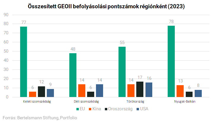 Nyugat-Balkán: Az EU fölénye itt a legstabilabb – kapcsolatai több mint ötszörösen erősebbek, mint a többi nagyhatalomé. Kína azonban főként Szerbián, Észak-Macedónián és Montenegrón keresztül zárkózik fel, míg az USA és Oroszország visszaesett, utóbbi legalábbis papíron biztosan. A teljes képhez azonban hozzátartozik, hogy bár a korábban meglévő fegyverkereskedelem és pénzügyi szolgáltatások szinte teljesen megszűntek, az oroszoknak bőven lehet még „rejtett tőkéjük” a térség befolyásolásához.