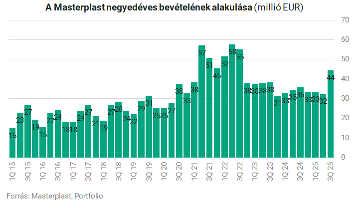 A pozitív folyamatoknak köszönhetően rég nem látott bevételnövekedést ért el a Masterplast a harmadik negyedévben, az előző év azonos időszakához képest 24,5 százalékkal emelkedett a bevétel. Az időszakot 44,5 millió eurós bevétellel zárta a cég, ami
