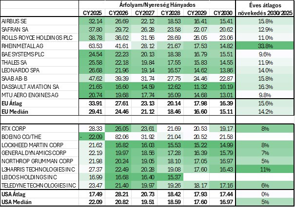 Ami az értékeltséget illeti, a már említettet jelentős részvénypiaci emelkedés megemelte ezen cégek rövid (1-3 éves) távú értékelési szorzóit. Ennek legfőbb oka, hogy a hadiipari kapacitások kiépítése tőke- és időigényes folyamat, amelynek eredményhatása csak több év múlva fog jelentkezni. Ha a hosszabb távú előrejelzéseket vizsgáljuk, nem látszik túlértékeltség, a magasabb növekedési kilátások kompenzálják a magasabb értékelési szorzókat.