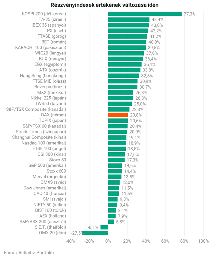 A vezető német részvényindex, a DAX idén már 20 százalékot emelkedett, ezzel a középmezőnyben van.