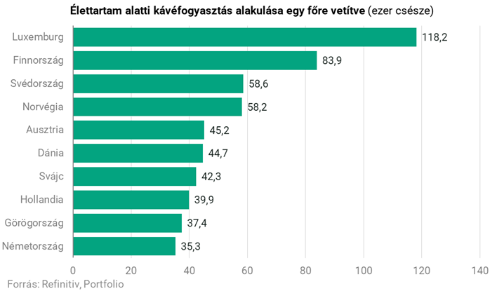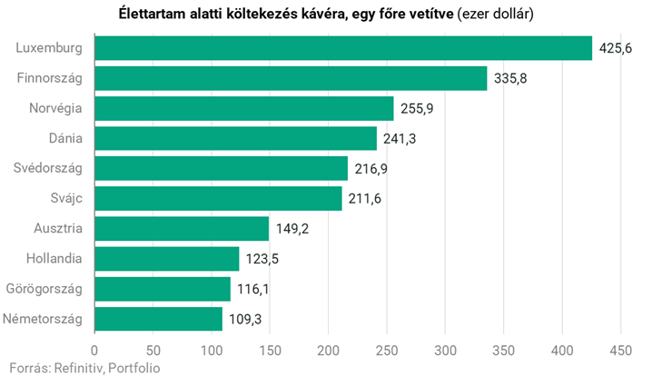 De ennél is tovább megy az elemzés, és az átlagos kávéárakat megbecsülve azt is megmutatja, hogy átlagosan mennyit költenek a kávéfogyasztók egész életük során feketére az egyes országokban, dollárban kifejezve. Na már most, ha a luxemburgi átlagos költést forintban szeretnénk kifejezni, akkor