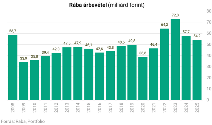 A bevételi oldalon egyértelműen érződik a negatív piaci környezet: a csoport árbevétele 6,1 százalékkal, 54,2 milliárd forintra csökkent 2025-ben. A visszaesés mögött a haszongépjármű- és a mezőgazdasági piac gyengélkedése áll, ami érzékenyen érintette a Rába fő szegmenseit. A legnagyobb exportkitettséggel rendelkező Rába Futómű Kft. forgalma 6,5 százalékkal, míg a személyautó-piachoz kötődő Rába Járműalkatrész Kft.-é 12,2 százalékkal esett vissza. Ezzel szemben a kisebb súlyú Rába Jármű Kft. kiemelkedő, 40 százalék feletti bővülést ért el. Ez rámutat a portfólión belüli eltolódásokra: a nagy volumenű exporttevékenység gyengül, míg a projektalapú belföldi üzletágak súlya növekszik.