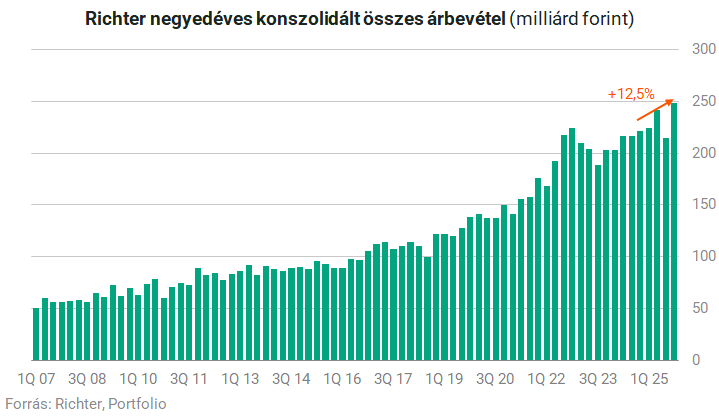 Az október-decemberi negyedévet 248,8 milliárd forintos bevétellel zárta a Richter, ami 12,5 százalékos növekedés az előző év azonos időszakához képest.