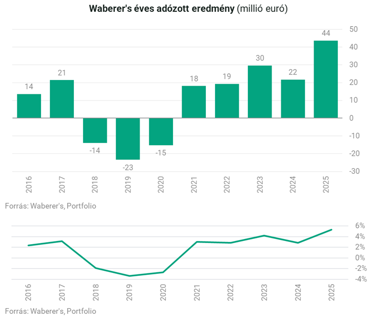 Összességében erős számokat szállított a Waberer's 2025-ben, a vállalatcsoport konszolidált árbevétele közel 8 százalékkal, 816 millió euróra emelkedett a tavalyi év során. Ugyan ez 10 százalékkal alacsonyabb, mint amire az elemzők számítottak, az eredménysorok növekedése pozitív meglepetést okozott. Az EBITDA 16 százalékkal 119 millió euróra emelkedett, míg az EBIT 58 millió eurót ért el. Utóbbi összhangban van azzal, hogy a menedzsment a tavalyi év elején 50 millió euró feletti EBIT-cél tűzött ki.
