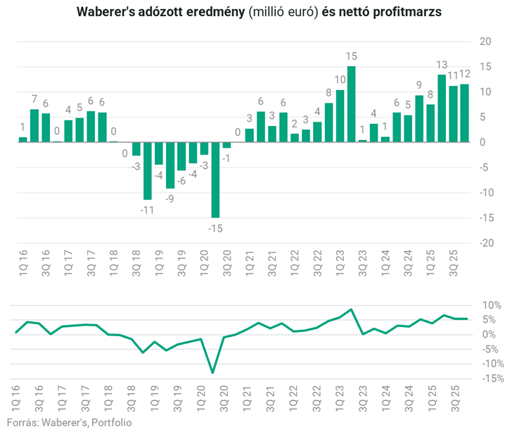 Éves szinten a Waberer's EBIT-je 29 százalékkal 58 millió euróra ugrott, ami rekordszintű, 7,1 százalékos EBIT-marzsot eredményezett.