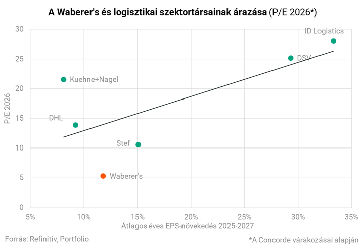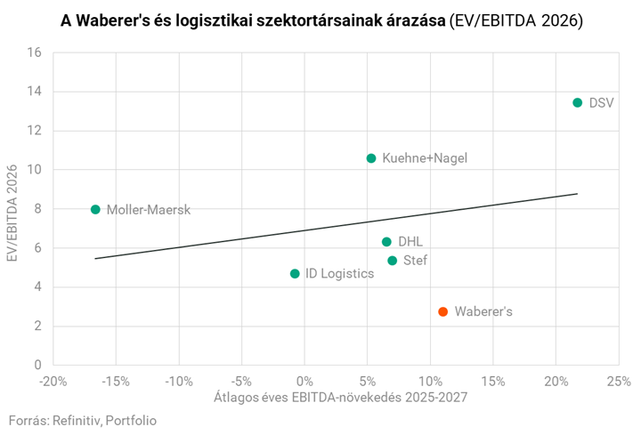A logisztikai szektortársakkal való összehasonlításhoz EV/EBITDA mutató a legcélszerűbb, mivel a logisztikai cégek működési teljesítményét jobban összehasonlíthatóvá teszi azáltal, hogy kiszűri a tőkeszerkezet és részben a számviteli amortizáció torzító hatását. A Waberer's EV/EBITDA mutatója mindössze 2,8-as a 2026-os konszenzusos EBITDA-várakozások alapján, ami nem csak a legalacsonyabb a peer groupban, de a maga 11 százalékos várható éves átlagos EBITDA-növekedésével a Waberer's rendelkezik az egyik legmagasabb növekedési potenciállal.