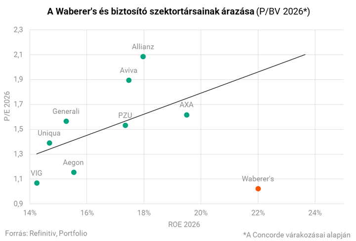 A biztosítási szegmenshez egy újabb árazási mutatót, a P/BV-t vesszük, mivel a biztosítóknál a saját tőke különösen fontos értékmérő, hiszen az eredménytermelő képesség és a tőkemegfelelés szorosan kapcsolódik a mérlegben lévő nettó eszközértékhez. A Waberer's 2026-os P/BV rátája mindössze 1-es, ami jelentősen elmarad a szektortársak 3,2-es átlagától. Ráadásul a 2026-ra várható sajáttőke arányos megtérülés (ROE) 22 százalékos értékkel meghaladja a peer group átlagát, ami nem indokolná a diszkontot.