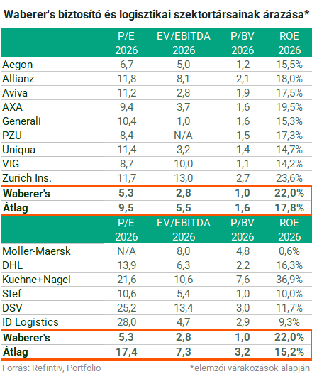 A Waberer's árazása trükkös, ugyanis a cég egyszerre logisztikai vállalat és biztosító - a Posta Biztosítók akvizíciója óta ráadásul rendkívül megerősödött a biztosítói láb. Ez azt jelenti, hogy nem igazán lehet olyan vállalatot találni, amelyikkel tökéletesen összehasonlítható a cég, így az összehasonlító árazás is nehézkes. Az egyetlen járható út, hogy ha külön logisztikai szektortársakkal és biztosító szektortársakkal is összevetjük. Emellett fontos azt is megemlíteni, hogy relatíve alacsony a részvény elemzői lefedettsége, és nem minden elemzőház hozza nyilvánosságra az alábbi mutatószámok kalkulálásához szükséges várakozásait.