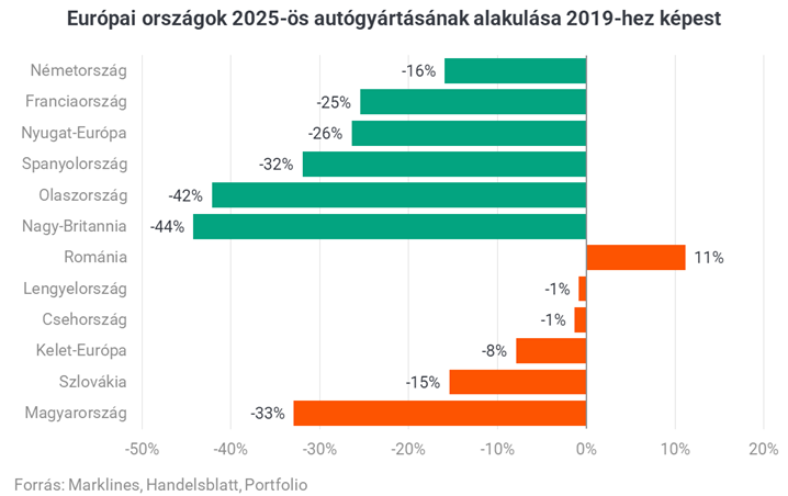 A kontinens autógyártása egészében véve is jelentősen visszaesett az elmúlt években. A tíz legnagyobb európai gyártóországban 2019 és 2025 között 16,3 millióról 12,7 millióra esett a személyautó- és könnyű haszongépjármű-termelés, ami 21,9 százalékos csökkenést jelent. A visszaesés azonban nem egyformán érintette a régiókat, Nyugat-Európában 26,4 százalékos volt a mérséklődés, míg a legnagyobb kelet-európai gyártóországokban csak 7,9 százalékos. Németországban 15,9 százalékkal esett a termelés 2019-hez képest, miközben Nagy-Britanniában és Olaszországban 40 százalék feletti volt a zuhanás.